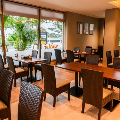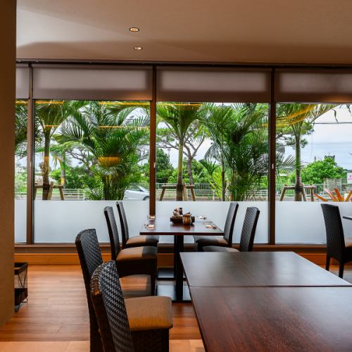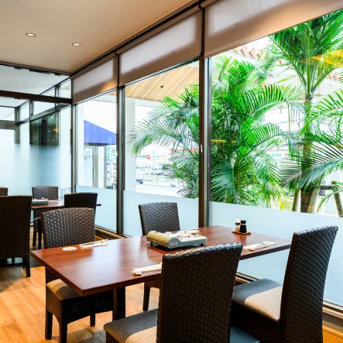 大きな窓一面に広がる青々としたヤシの木が、南国リゾートの雰囲気を演出します♪あたたかな自然光が差し込む店内で、外の景色を眺めながらゆったりとお過ごしいただけます◎日常を忘れさせるような緑豊かなロケーションで、特別なお食事のひとときを。