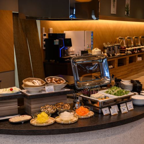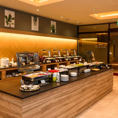 温かい照明が心地よい、ホテル内のビュッフェ♪木目調のインテリアと壁の植物アートが魅力的です。ゆとりある店内は開放感があり、どなたでも快適にお過ごしいただけます◎